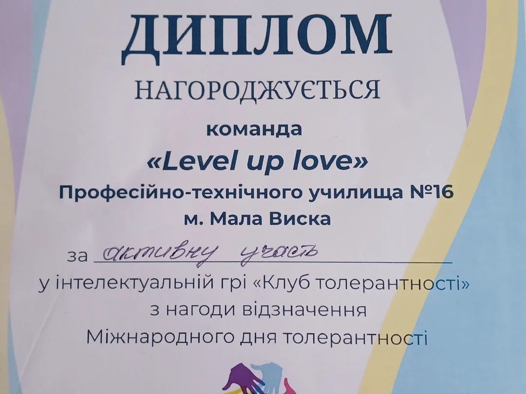 Наш заклад гідно представила команда «Level up love», учасники якої продемонстрували активність, креативне мислення, командну згуртованість і високий рівень обізнаності з питань толерантності. За підсумками заходу команда була нагороджена дипломами за активну участь.